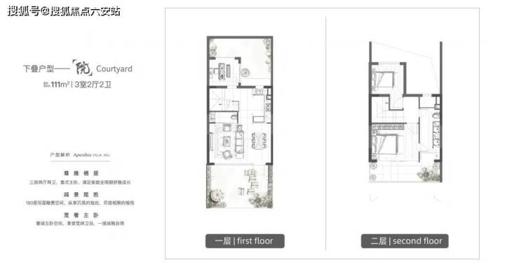 建面约111m²三室两厅两卫下叠,打造180°双面瞰景空间,约20 m²南向入户花园,作为聚会茶区,闲暇时可与朋友喝茶品花,北面的花园,将承载更多生活意趣。2楼设计了尊崇主卧套房,独立卫浴,营造优雅私密的起居空间,更打造生活功能露台,无论是瑜伽或是晾晒等生活需求,都能满足。