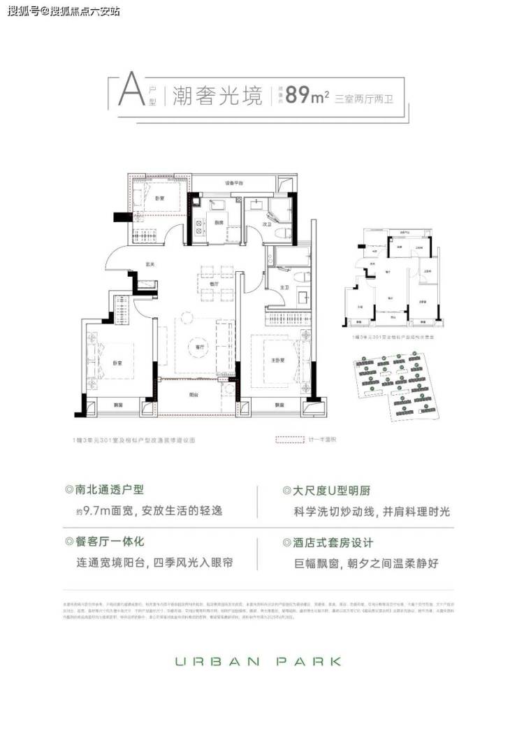 拿本次主力户型约89㎡三房举例,即便最小的房间也能作为卧室使用,真正的大三房;明厨双明卫,真正的全明设计;三开间朝南,南向采光面长约9.7m;主卧套房,含飘窗面积约20㎡,格局相当阔绰。