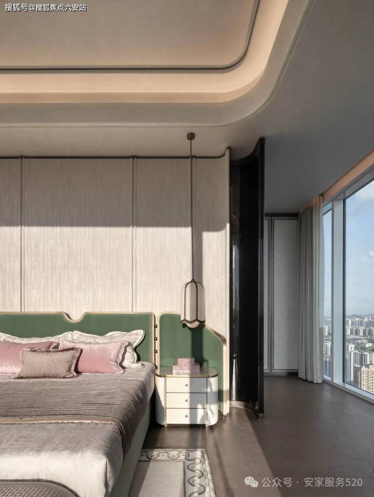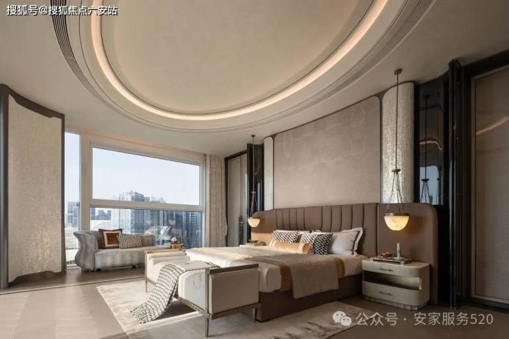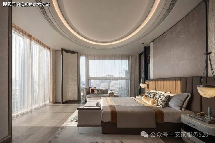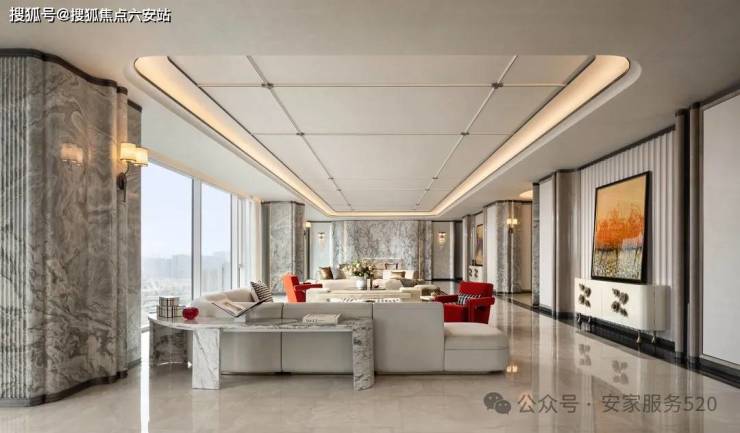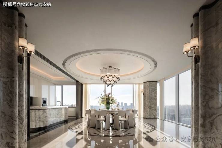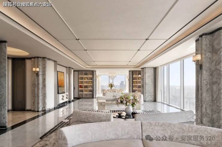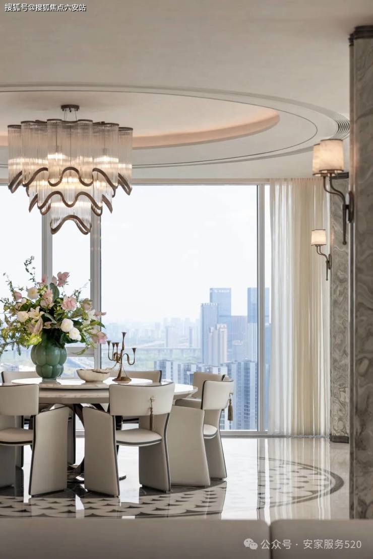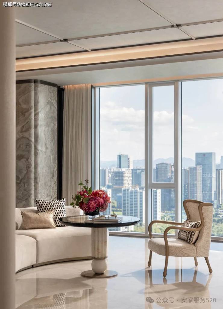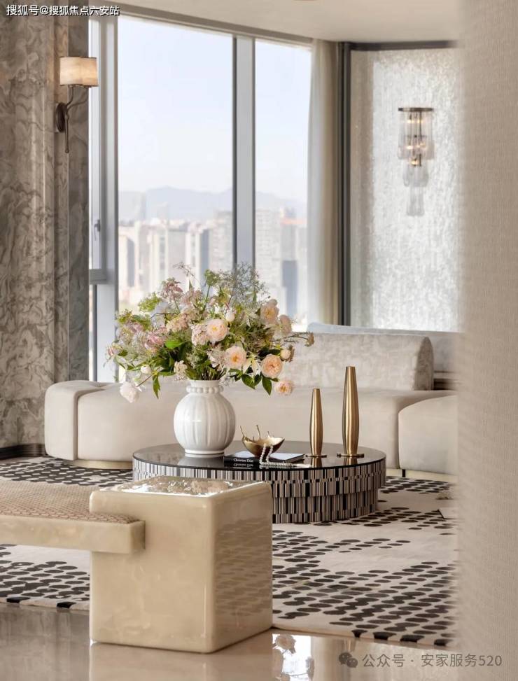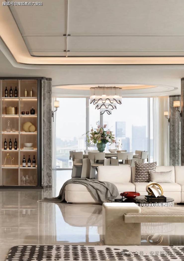 步入客厅,巨大的落地窗将城市全景无缝接入室内,成为最变幻莫测的动态壁画。流线型结构柱巧妙地置于空间动线节点,其柔和的曲面消解了柱体的笨重感,演绎出刚柔并济的东方哲思。