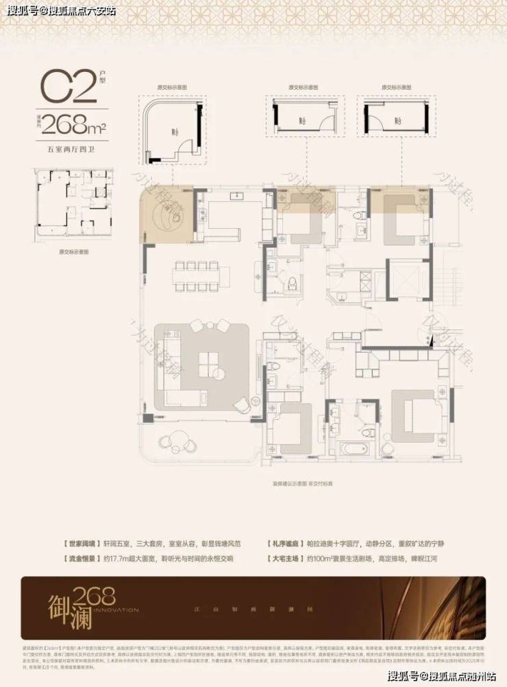 所有户型均为纯正五房设计,创新“三套房”体系,满足多代同居需求。268㎡户型实测得房率约91%,通过取消飘窗、优化管井布局,实现空间效率最大化。