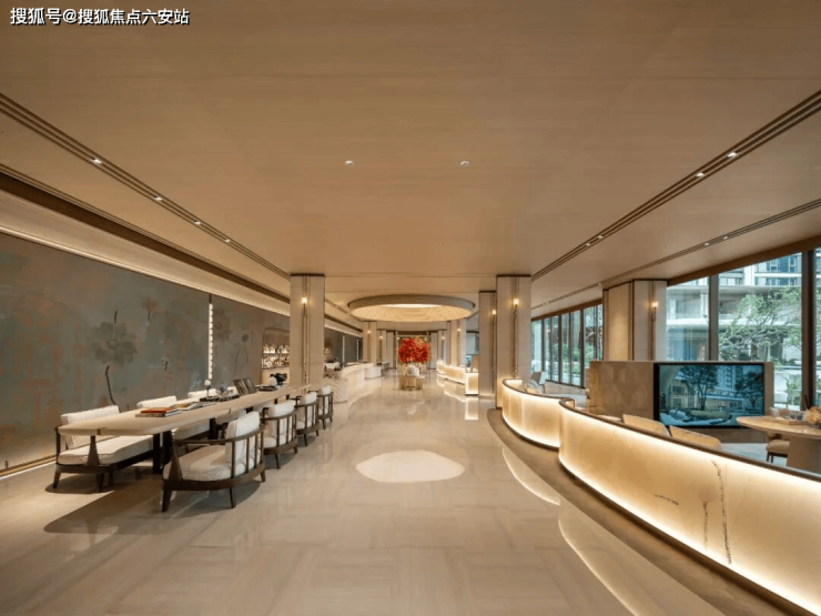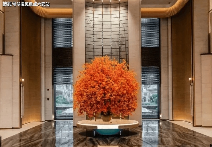 “玉琮之门”归家礼遇:主入口以杭州博物馆镇馆之宝“玉琮”为原型,75米超宽幅面、10米高空间,搭配贝金米黄石横向肌理、月牙弧线,呼应西湖水波;