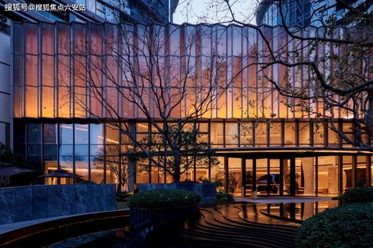 景观设计上,入口景观及裙房屋顶花园打造双花园,以“钱塘江”“西湖”为设计灵感,提炼出“浪潮”“茶田”“茶花”为主题的景观元素,融入艺术张力与场地情怀,打造出赏景畅谈式私家花园,为生活在快节奏的都市中的人们提供了一片静谧的休闲空间。