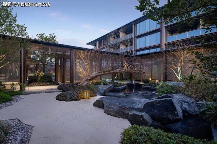 一扇门,门外是喧嚣,门内是静雅。跨过大门,只见梅花树矗立中央,搭配高低错落的黑松树和山石,树下潺潺的水镜,映衬着落梅图案纹理,形成一幅寒梅山涧盛放的山水画卷。