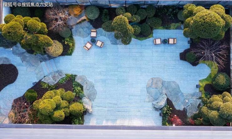 穿过景墙是下沉水院,连着售楼大厅和松林剧场,一边是水瀑潺潺,流淌成一幅古雅的宋韵山水画卷,一边是肆意舒展的罗汉松、老红梅、羽毛枫,铺展出悠远的东方意境。