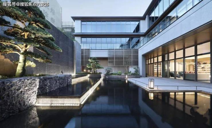 不止飞瀑,实际上在河印府的示范区中,水是贯穿其中的重要元素,从前场到过渡空间再到下沉庭院,或镜面、或溪涧、或叠水,通过不同的形式形成了概念上的「山环水绕」,也是寓意上的好彩头。