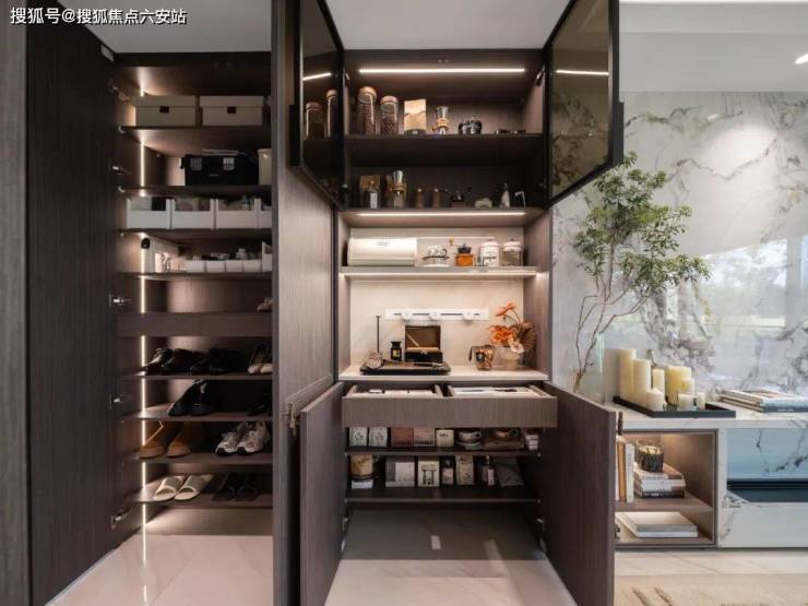 不同于普通柜,望云润玺独家定制玄关+餐边柜一体化魔方柜,一家人的鞋子都能妥贴安置。