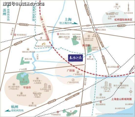 项目落子于平湖广陈镇黄金轴心,与上海金山廊下镇仅一河之隔,自驾通过莲廊专线2.5公里直达上海,距沪乍杭高铁金山北站约20公里,未来规划中的沪平盐城际铁路(2027年通车)将实现“高铁圈”通勤。