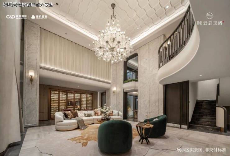 屋檐取形北京太和殿庑殿顶,融入良渚高台夯土文化,搭配铜狮、涌泉、五步青云阶,辅以琮黄色调装饰,营造归家非凡礼遇。