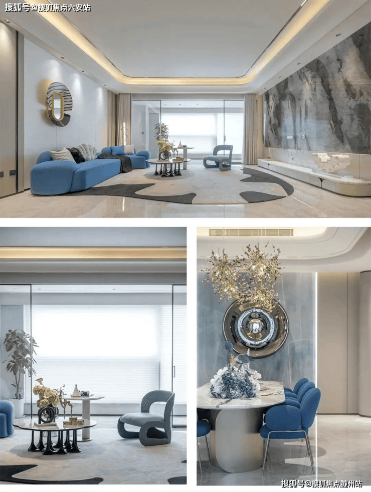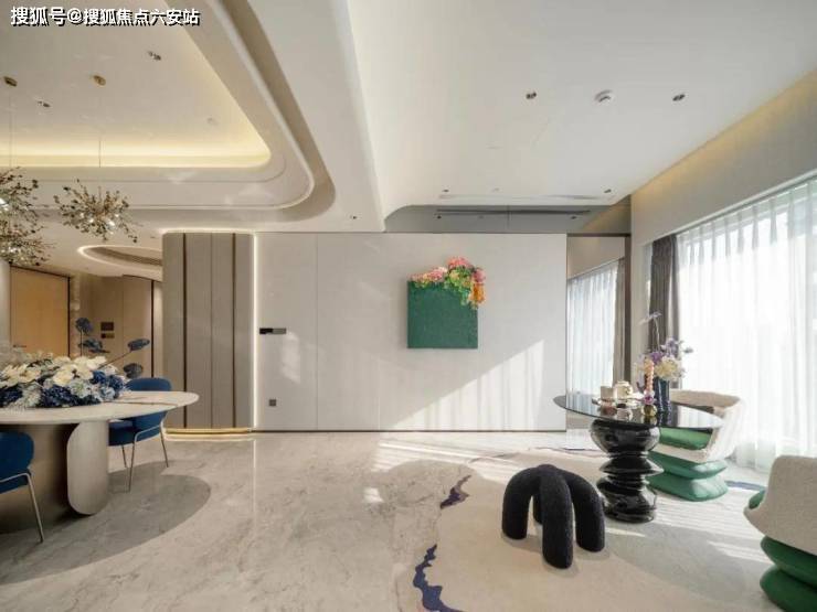 客厅选用芬迪白奢石作为背景墙,搭配金属框线,加强空间价值感。