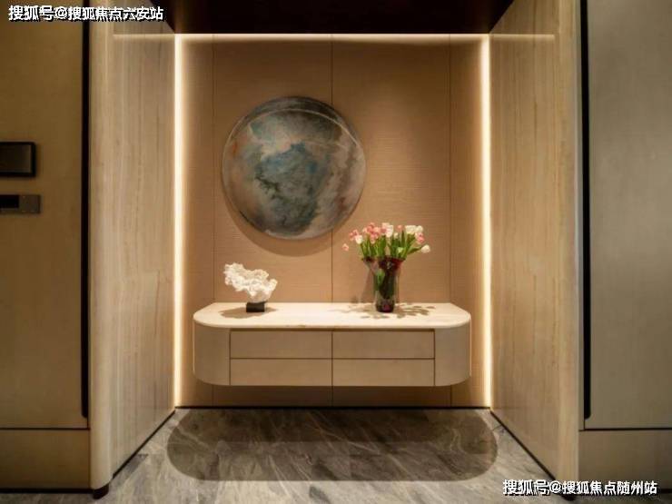 这是一套五房四卫的设计。步入玄关,大面积的直纹白玉和铜丝皮革组成的玄关背景,搭配富有禅意的软装和灯光,组成一幅绝美的3D壁画。玉石自然价值不菲,这个铜丝皮革用的是人工编织的铜丝,手感顺滑,当然它的价格也矜贵,光这幅背景就要近十万元。