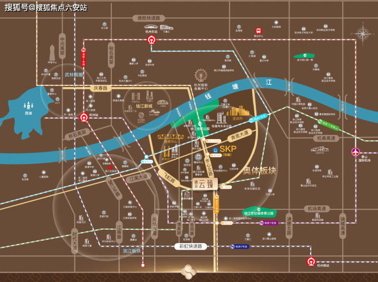 地理占位:项目位于杭州萧山区钱江世纪城奥体核心区,与钱江新城合称“杭州CBD双核”,毗邻地铁2号线飞虹路站,是TOD上盖项目,地铁出口直达地下室。
