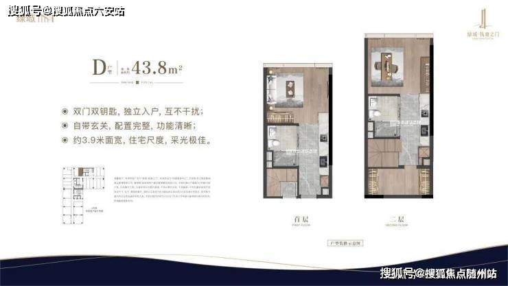 建面约35-59㎡双钥匙公寓:买一层送一层,实际使用面积可达约70-118㎡(含赠送空间)。下层可规划为“独立工作室+开放式厨房”(适合自由职业者或小团队办公),上层则是“卧室+衣帽间+飘窗”(私密感与采光兼具);