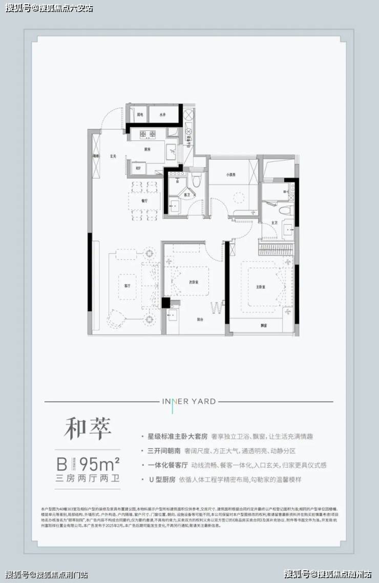 建面约95㎡三室两厅两卫的中间套,三开间朝南,总面宽接近9.8米,餐客厅一体化设计提高了空间利用率,整个竖厅非常阔绰,属于同面积段户型中的稀有物种。