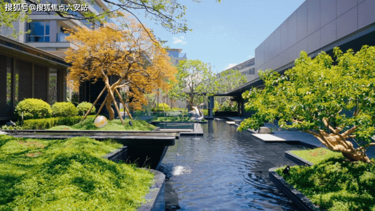 中心水院,如西湖水波,似江山如画。游廊漫回,亭台水榭,草木葳蕤,尽显东方雅韵。高层绿意疏朗,展现静谧雅致氛围;中层巧妙搭配特色树种,恣意蔓延;低层以不同花木勾勒,芬芳弥漫,营造“沉醉不知归路,误入百花深处”的美好意境,既有自然的艺术,又有生动的意趣。