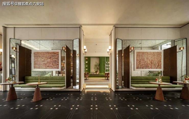 瑰丽元素,成为贯穿全局的风格标识,同款的通高玻璃格栅、泥客石荔枝面墙壁、云石壁灯,以及黑白棕三色石材的几何拼花地板,穿越时空遥相呼应。
