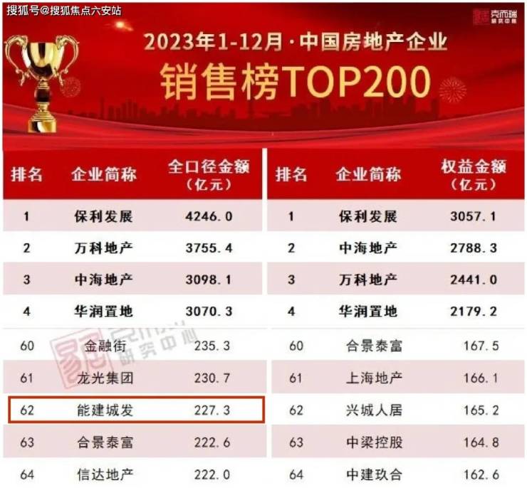 克而瑞数据统计,2023年中国房企TOP200销售排行榜中,能建城发以227.3亿元的全口径销售额,位居榜单第62名!