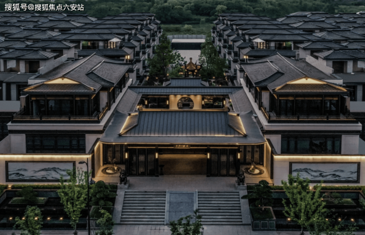 项目以南宋《千里江山图》为灵感,王府大门高筑台基,三间一启尽显门仪;坡屋顶采用金属钩边工艺,复刻宋代冰裂纹青瓷质感,荣获中国建筑工程装饰奖。立面融合现代玻璃观景窗,传统与当代碰撞出独特韵律。