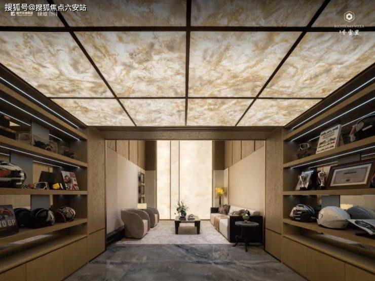 顶层茶室与露台营造山水意境,地下雅集空间木格栅、透光墙勾勒 “举杯邀月” 之境,夹层赛车展廊则平衡了雅静与动感。