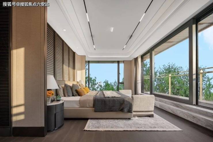 当第一缕阳光穿透蓝金坡屋顶的陶瓦,青岚府的庭院便成了光影的舞台。9米宽的灰蓝玻璃幕墙将青山湖的晨雾框成动态山水画,靛蓝色屋檐下,铜风铃与竹帘共奏晨曲。业主可在月影亭的铜壶滴漏声中煮泉,看罗汉松的剪影在宣纸般的墙面上缓缓移动——这是设计师用现代材料重构的《撵茶图》场景。