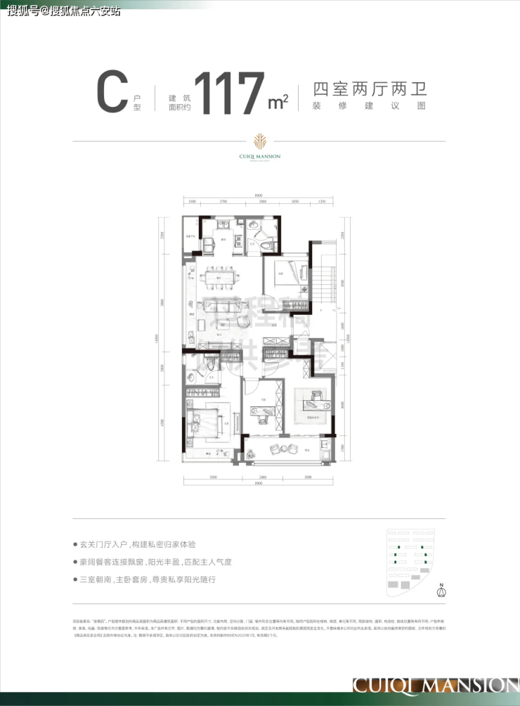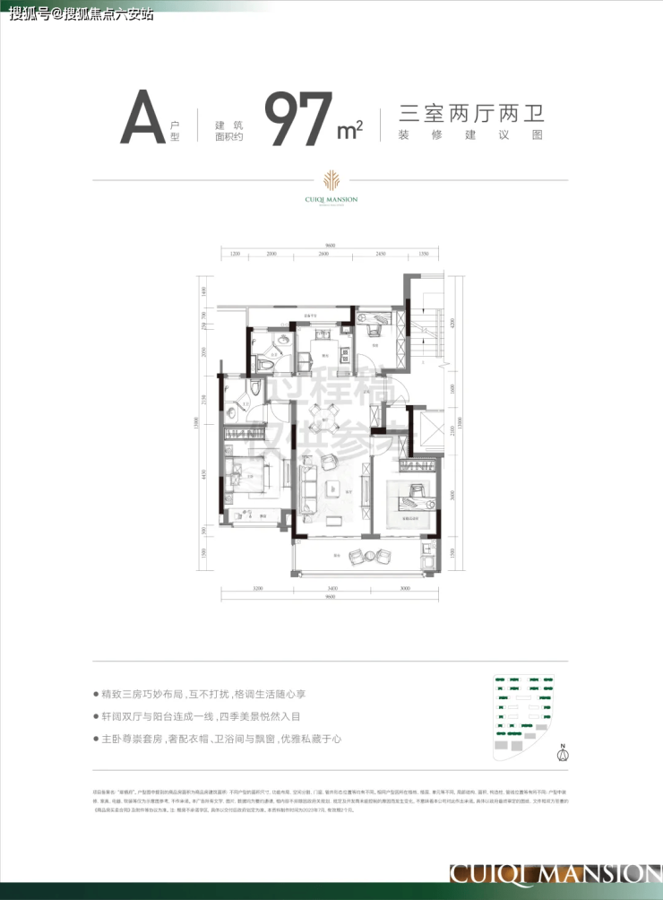 97㎡三房两卫:三开间朝南+双面采光阳台,主卧套房设计,套内面积约100㎡。
