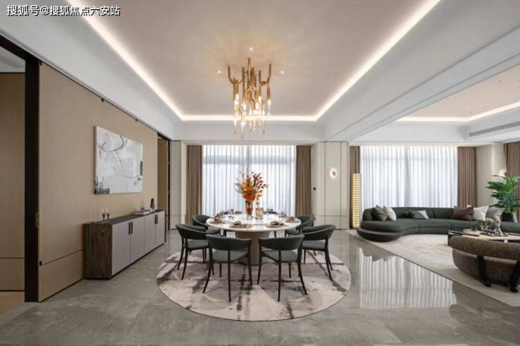 客厅背景墙用了一整面的玉翡翠,玉石的清透典雅带着远古冰川裂纹的幽深。双岛台的设计,是闺蜜下午茶的悠闲时光,美诺九件套,是爸爸带女儿下厨的鲜美飘香。三米的长茶台,茶韵悠长,十人的大圆桌,欢聚一堂。
