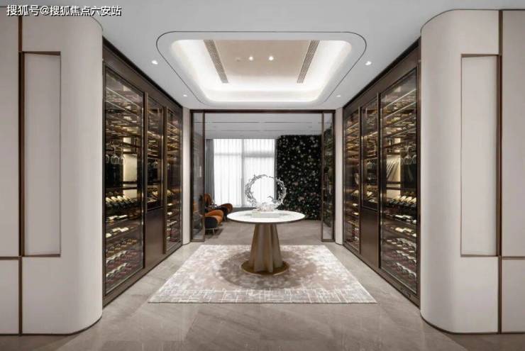 下楼再看下它的地库,因为更多的人都是开车回家,地下大堂和地面大堂同等重要,星光顶大堂,层高很舒适,是永生苔藓的绿意盎然,墙面岩板,吊顶铝板,还用石材包柱内嵌水晶灯柱,这样的配置在2万+大平层中极为罕见。