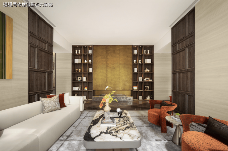 以“站立的西溪”为灵感打造的建筑体块,勾勒出“都市山水江南”的水墨意境,在世界级中轴线上擘画出新天际;超百方的巨幕会客厅,搭配270°环幕全景落地窗,将城市天际线与西溪生态盛景化作窗前流动的画卷,每一次极目远眺都是对高奢生活的时代注解。细节处,奢石与影木交相辉映,以水刀拼花工艺铺就艺术长廊,从电梯厅延伸至室内;大师美学灵感的奢雅渗透生活每一处肌理。