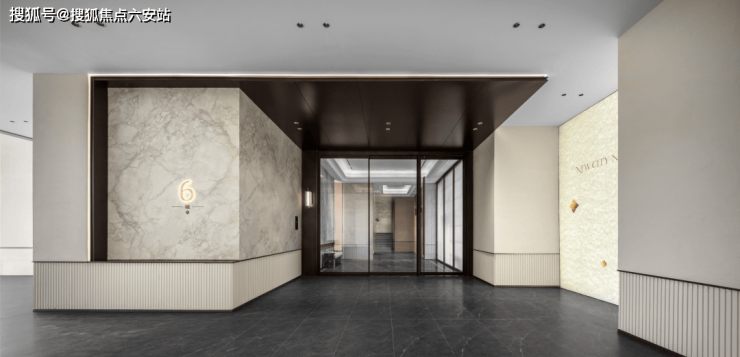 整扇大门采用铜艺浮雕,案名logo好像艺术雕刻镶嵌其中,搭配影壁灰色石材,在夜间光影的点缀下更显迎宾的尊贵感;上方5.5米的高尺度悬挑雨棚与建筑融合得更为紧密,突出建筑的整体性与和谐感;风雨连廊覆盖了归家动线,未来归家,晴雨无阻,即便风雨间亦能闲庭信步。