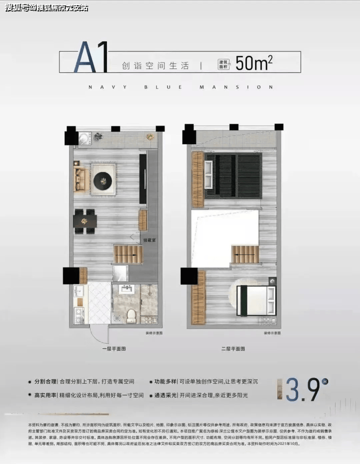 微LOFT:3.9米层高(A幢50㎡),空间利用率高。
