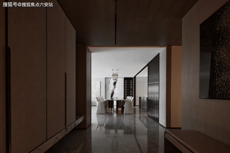 与宁静相视,得以感受从身体到心灵的放松状态,在此寻得一场安身和疗愈。深浅皮革包裹出墙面适宜的情感温度,金属嵌条穿越其间,在木质地面的催化下,似乎有着包容万千的气韵。