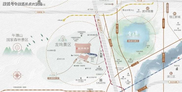 项目占据西湖龙井70%产量的核心产区,紧邻14000亩连绵茶园,负氧离子浓度常年维持在6000个/cm³,形成天然氧吧。其区位兼具"双景区"价值:北靠午潮山国家森林公园,南接三江汇流,东距西湖景区仅15分钟车程,西临在建地铁12号线龙坞站(200米),未来20分钟直达未来科技城与滨江,实现"出则繁华,入则宁静"的双城生活模式。