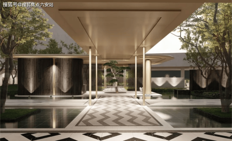 作为衔接入户大堂的水榭,“室外会客厅”的格栅虚掩如屏风,构成半合围的空间,向外连接着大堂、举步繁华都市,而往里走则可至自家奢华的酒店式单元大堂。