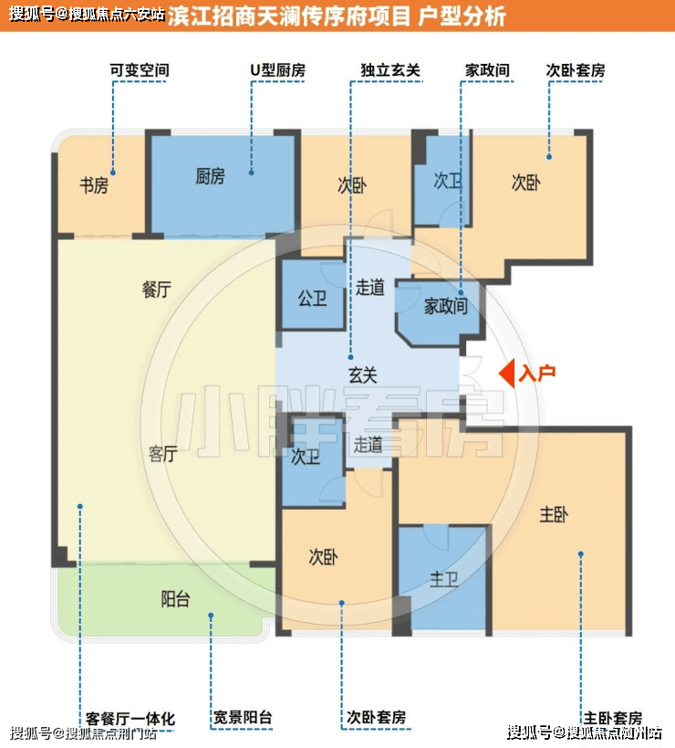 整体客餐厅南北通透,带有家政间,光从户型图来看入户无独立玄关,两梯两户的情况下,其实也可以把鞋柜等做到门口,或者视客餐厅尺度而定打造玄关柜。