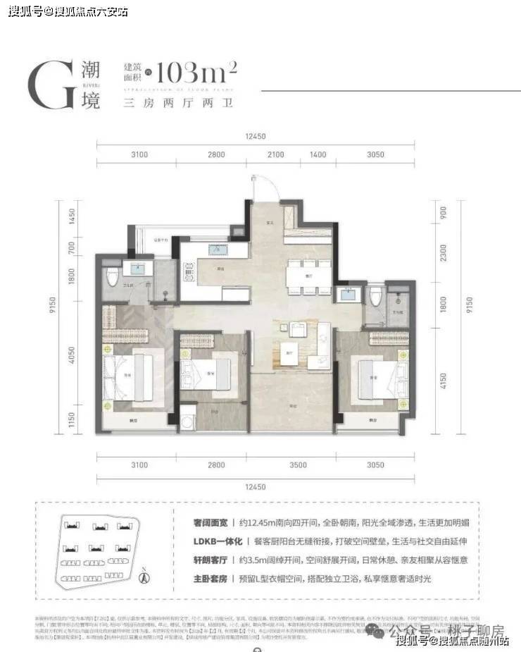 建面约103㎡的三房户型,四开间朝南,且南向面宽竟做到了约12.45米,阳光得以在全屋渗透。主卧预留的L型衣帽空间,让女主人一眼动心。