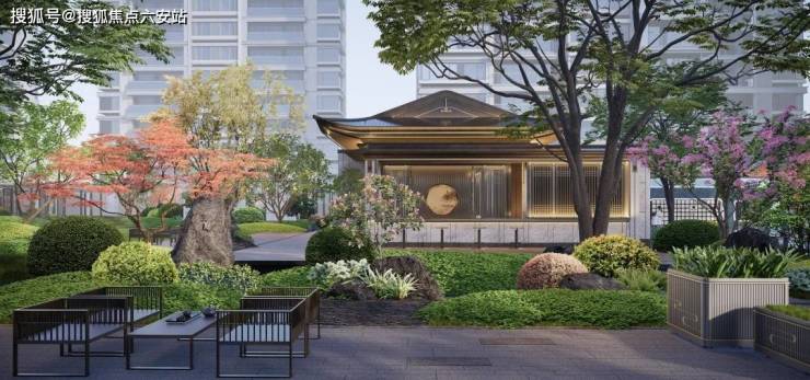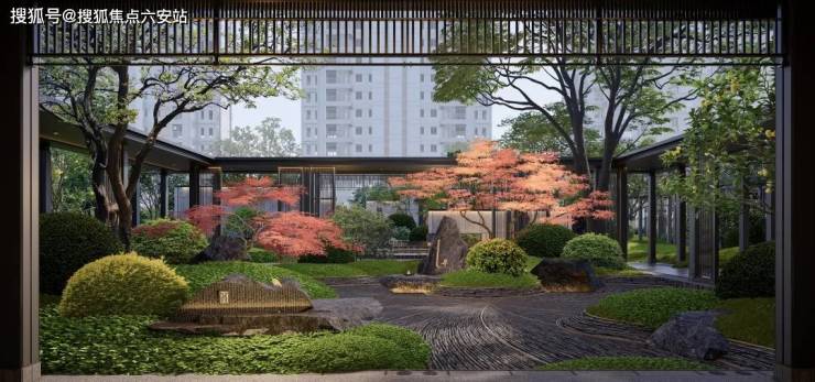 比如这一次的“建发式”大门一如既往,南北地块做了双大门设计,门头宽度达到约61米(含景墙)。入户做足了仪式感:重檐悬山式门楼、芝麻黑石材地雕、“鱼跃龙门”御道,两侧伫立着石狮、影壁、跌水、绿岛,还有两株精挑细选寓意“财富与健康”的罗汉松。接着就是“三进式”中式园林铺陈开来,曲径通幽,别有洞天。从“晓风禅院”穿过装饰垂花柱的将军门,是栽植乌桕、罗汉松等名贵树种的“叠翠禅院”。
