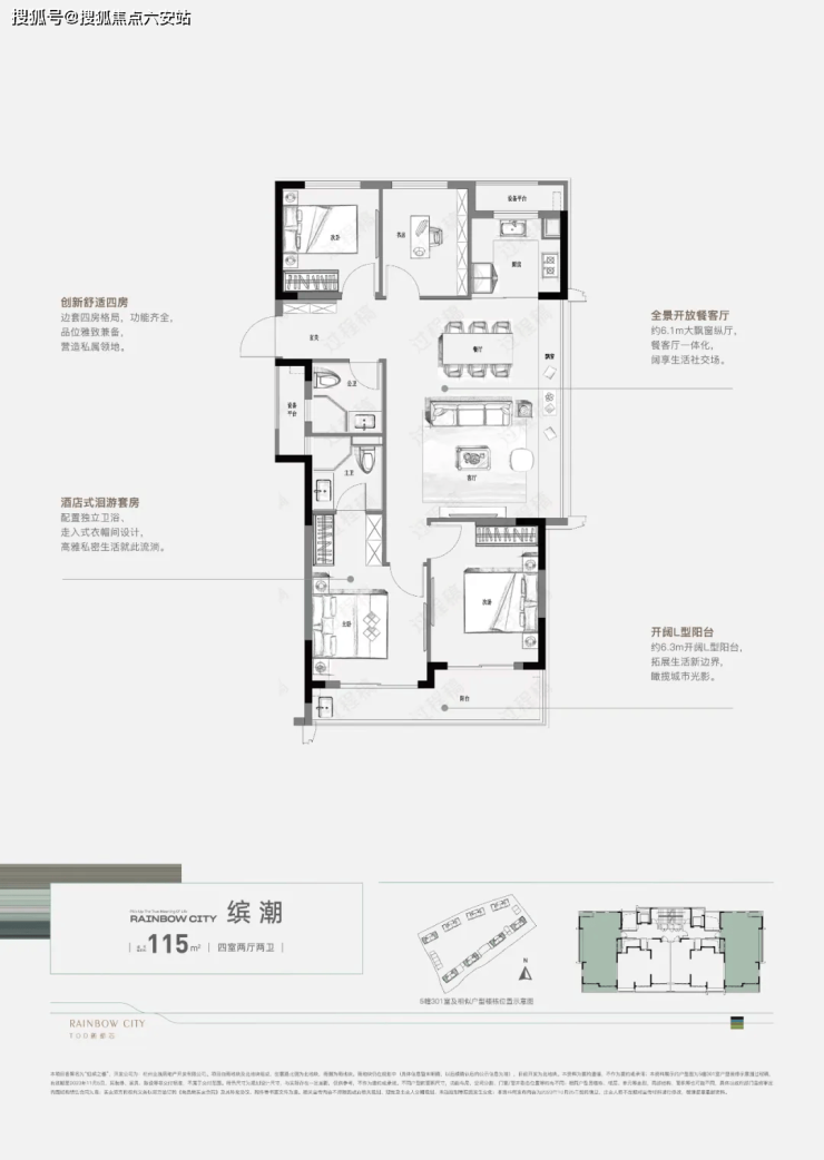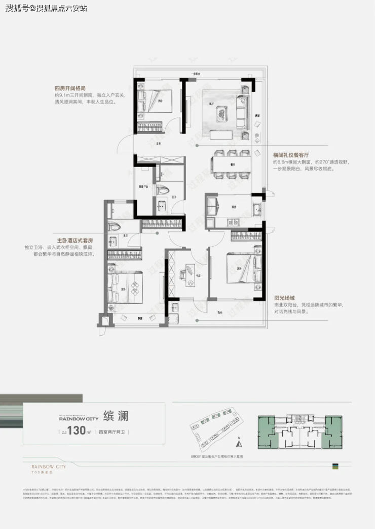 建面约115㎡边套四房格局,约6.1m大飘窗纵厅,餐客厅一体化设计,延展空间视野的同时,让生活向阳而生,让窗外的风景倒映成美丽的画框。建面约130㎡四房,约6.6m横阔大飘窗全景客厅,约270°全景通透视野,一步观景阳台,北望银湖公园,自然风景尽收眼底。