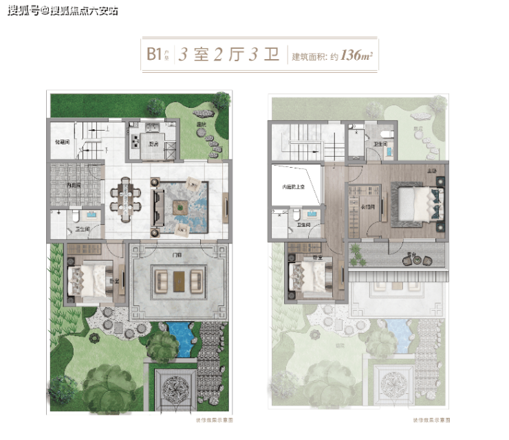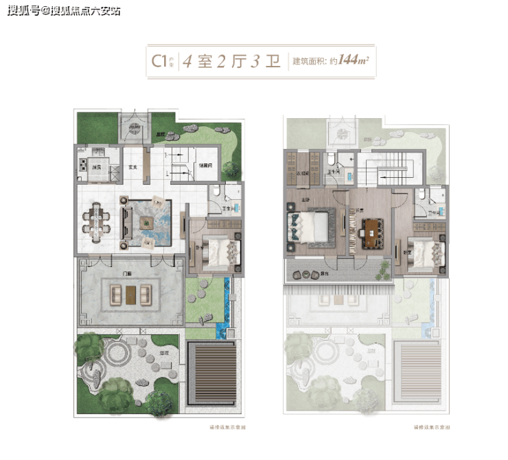 主力户型为建面130-370㎡,涵盖三至九房配置。以144㎡户型为例,三开间朝南设计,餐客横厅面宽达6.6米,直通景观庭院;一楼设置3.3米面宽老人房,二楼双套房搭配开放式书房,主卧套房连接6米挑高露台,兼顾功能与意境。建筑外立面采用传统白墙黛瓦与现代工艺结合,飞檐翘角、月洞窗棂等细节暗藏《园冶》《芥子园画谱》等典籍中的东方美学密码。