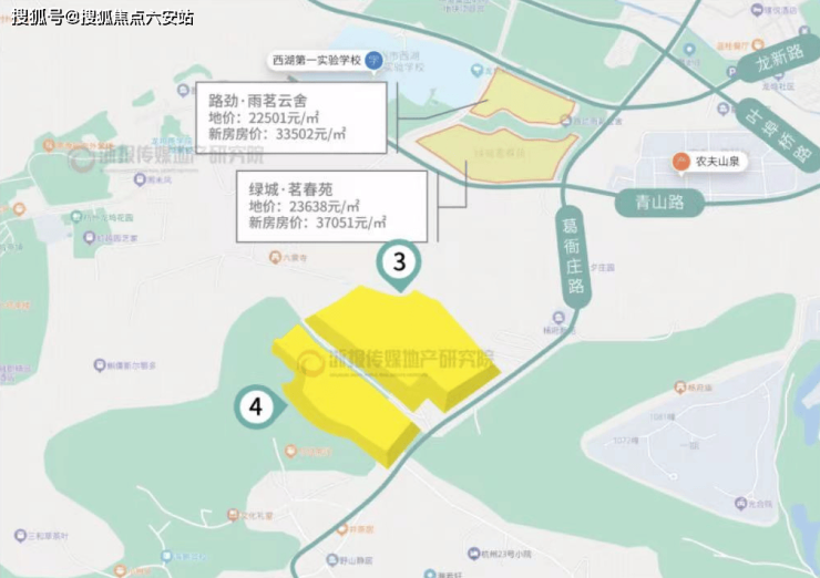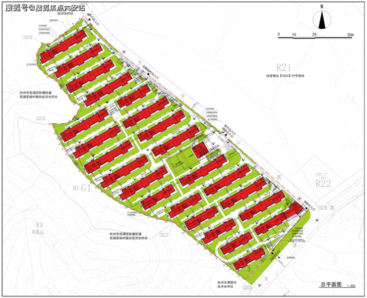 纵览中海·月陇云岚的地理环境,整体生长于茶陇之上,西侧与北侧皆被苍翠的龙井茶山环绕,地块自东南向西北形成起伏的坡地高差,山水脉络和建筑分布形成围合之势,茶山青绿与西湖涟漪皆相融于此,孕育一片隐于自然的山水台地。