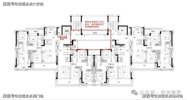 首先这个户型解决了中间套的隐私问题,如上图所示,两个边套回家都不需要经过连廊,所以保证了中间套的私密性。