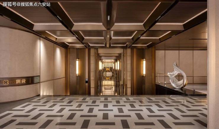 沿水纹复刻钱塘江潮的“浪花御道”拾级而上,上等黄铜打造、高约2米(含基座)的镇宅铜狮分列两侧,还搭配了罗汉松和松下涌泉,中间巨大铜门之上更有大师执笔的匾额。