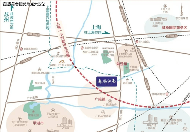 咫尺上海 田园小镇位于虹桥南向拓展带,与上海廊下郊野公园仅一河之隔,距莲廊专线约3公里,咫尺上海,畅享平沪同城生活圈。
