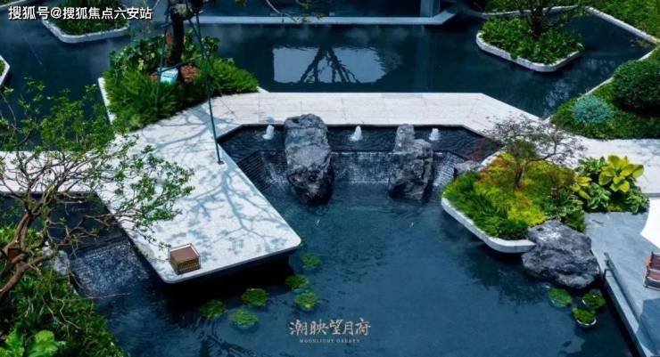 在社区整体规划方面:潮映望月府通过景观空间的差异化分配,创造出更大的核心景观空间,演绎出“大围合”的庞大中心园林尺度,并配合不规则水景、架空层的营造,塑造出极具度假质感与休闲气质的核心景观空间。