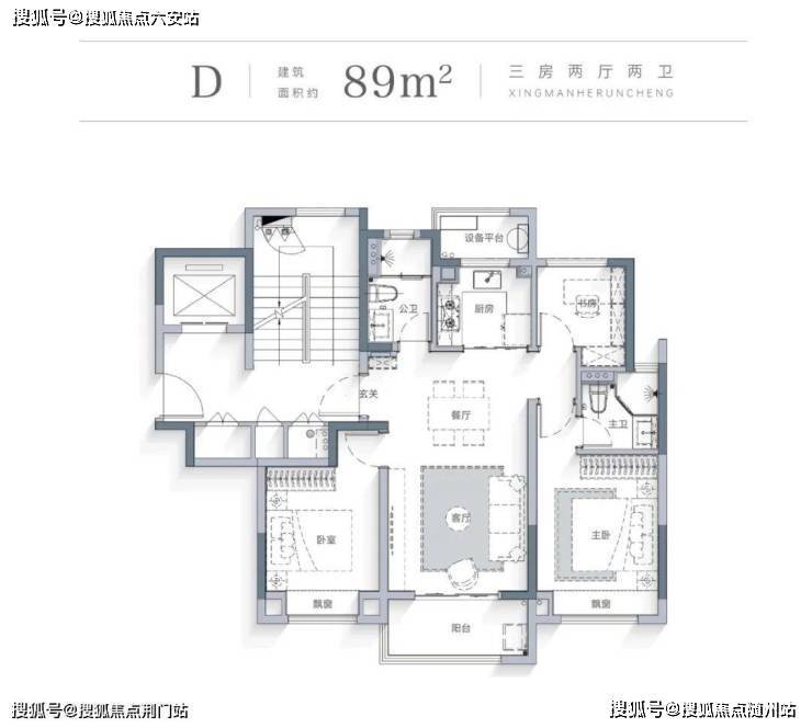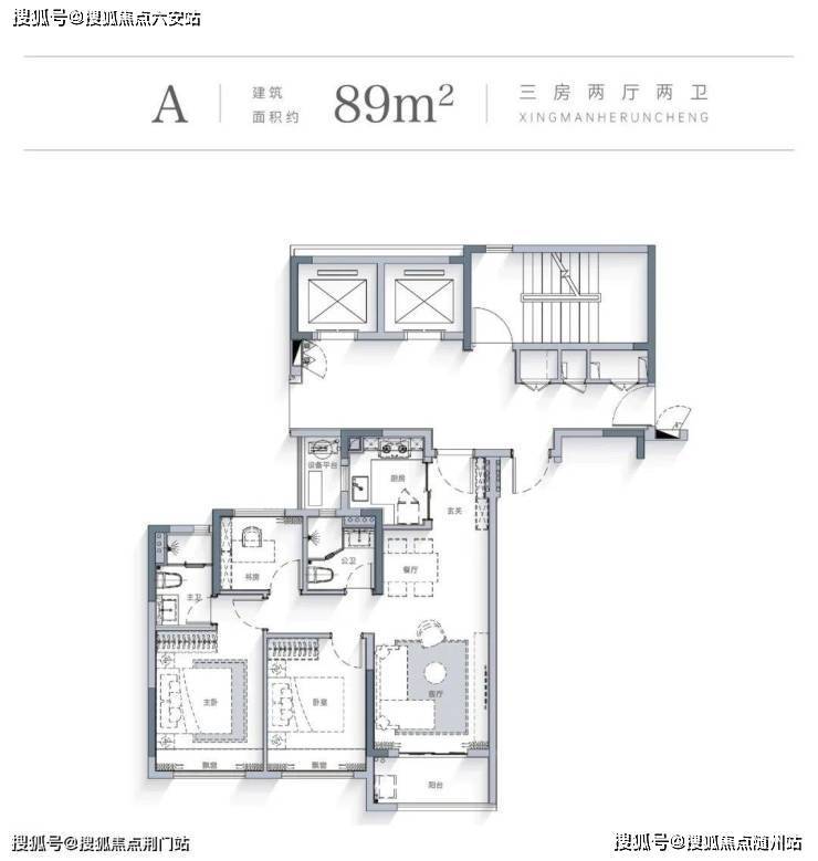 星缦和润的约89㎡洋房户型是1梯2户,不仅南北通透,格局也是3开间南的“飞机户型”。