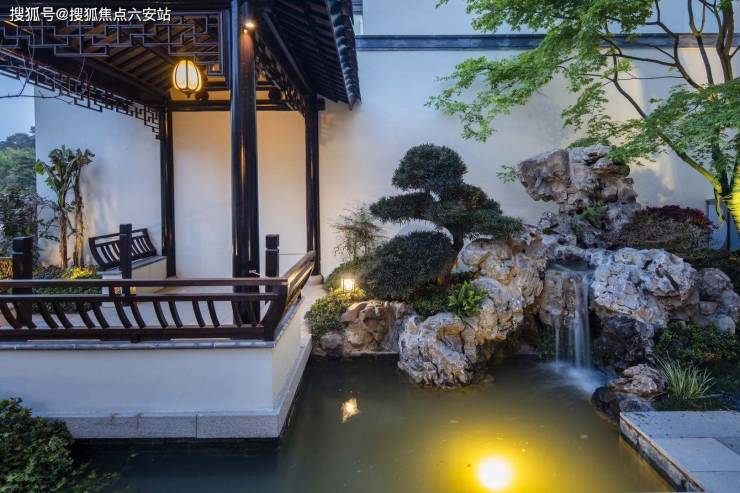 白墙黛瓦,淡雅高洁,苍松翠柏,静守庭院,一如文人风骨,假山造景,石块叠加。倚墙而筑,营造浓郁的中式格调