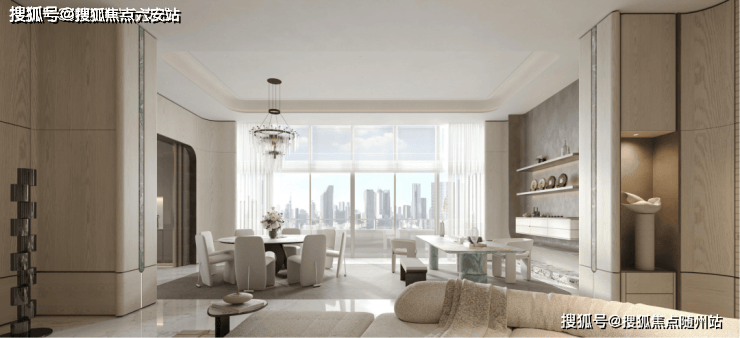 玄关后,豁然开朗的是一个近100㎡的超奢餐客厅。作为全家人的会客、互动空间,基于方正的格局,餐客厅还外接跑道式阳台,不仅进一步抬升了空间的朗阔感,也让清风能携四季入室。
