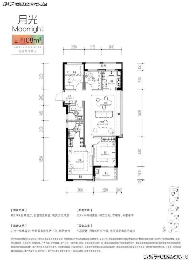 270度环绕式采光,视野绝佳;主卧独立卫浴、走入式衣帽间、南向阳光飘窗,享优雅随心的寝居感受;阔约5.9米带飘窗的边厅,与带大开窗的厨房无界联通,加上独立玄关,4房功能齐备。
