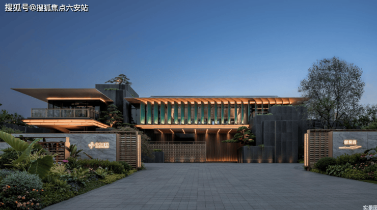 写意中式风雅 宋风建筑的当代表达在立面打造上,提取宋代歇山顶样式,转译形成深远的挑檐,整体呈现一种清雅内敛的当代气质;大尺度巨幕玻璃窗镶嵌金色铝线条,极简化打造光影天幕,倒映自然之境;臻选靛蓝色的陶瓦,原创蓝金坡屋顶,掀起杭州合院立面的新序章。