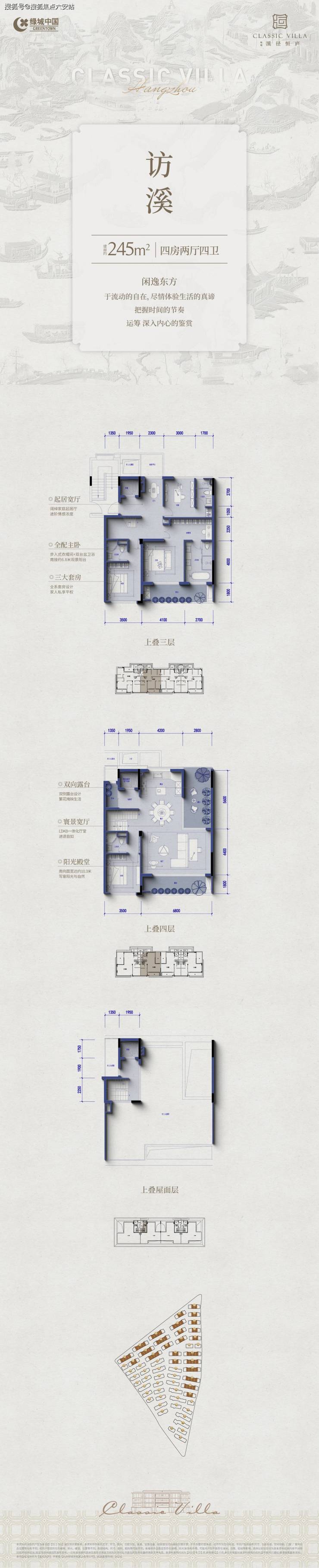 空间布局:四房三厅四卫,南北双庭院,主卧套房带步入式衣帽间;