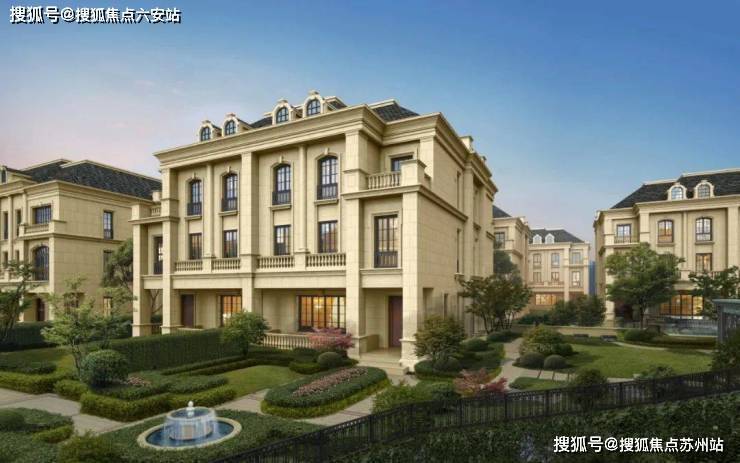 整个园区,以经典的绿城法式墅区景观大中轴贯穿,占地约1000多㎡,联排建筑的设计,融合了中国传统院落布局与法国枫丹白露宫的审美,外立面大面积采用全石材干挂,檐口等细节部位使用仿石。