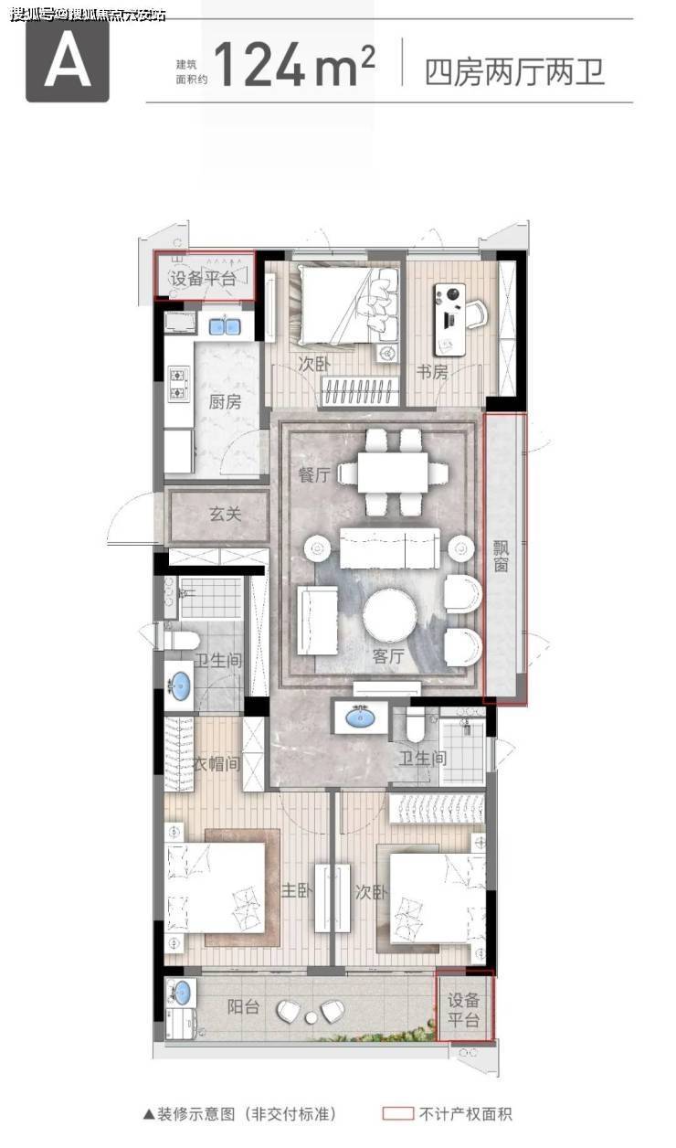 户型面积:主力94㎡三房两卫、124㎡四房两卫,全精装交付,标准约3000元/㎡(含科勒、西门子等品牌)